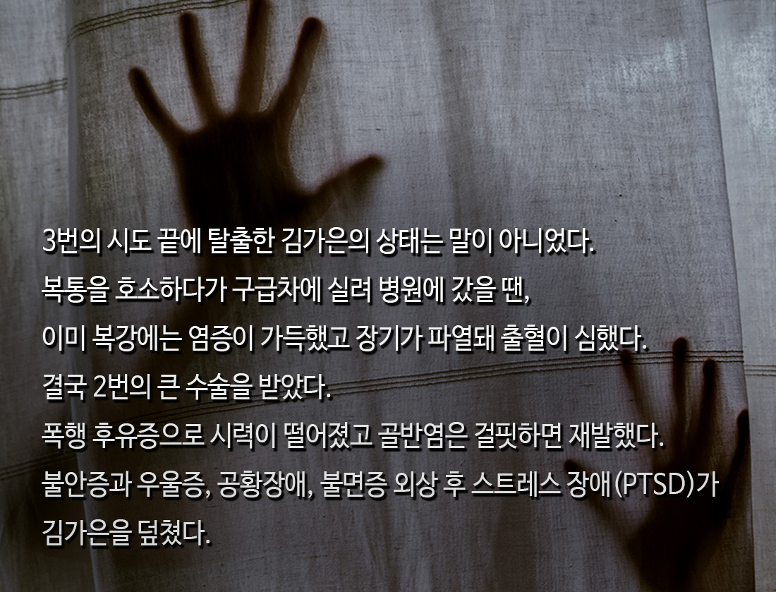 이렇게 죽으나 저렇게 죽으나 매한가지구나 생각한 순간 도망치려 문 쪽으로 달렸다. 도어락 풀리는 시간이 정말 길게 느껴졌다. ‘띠링’ 소리와 함께 머리채가 잡혔다. 문을 열고 ‘살려주세요’ ‘도와주세요’ 하고 비명을 질렀지만 세상은 고요했다. 머리채가 잡힌 채 질질 끌려 들어가 다시 미친 듯이 맞았다.
