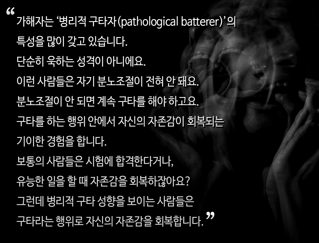 “인지적으로 노예가 될 때까지 계속해서 여러 가지 이야기를 합니다. 이야기의 핵심은 ‘그래서 넌 맞을 만하다. 그래서 나는 때려야 한다’입니다. 때리고 맞는 것에 관한 합리화를 세뇌 수준으로 반복하죠. 그 밑바닥에는 열등감과 피해의식이 자리하고 있습니다. 예를 들어 아내를 때리는 남편이 ‘너만 없었으면 내가 성공했을 텐데, 너와 결혼해서 내가 이 모양 이 꼴로 산다’고 말하는 식입니다”